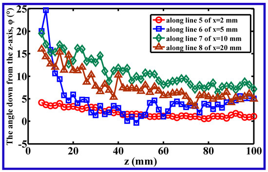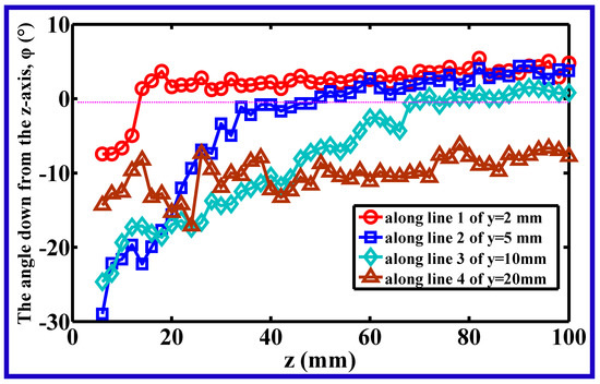 Figure 6 shows the directional angle between the z-axis and the resultant velocity in the y–z plane (here, resultant velocity in the y–z plane means the projection of the air resultant velocity on y–z plane), at different positions along lines 1–4 (lines 1–4 correspond to the lines of y = 2, 5, 10, and 20 mm in the y–z plane). The resultant velocity in the y–z plane consisted of the component velocities of vy and vz, where vy was definitely the lateral component velocity.