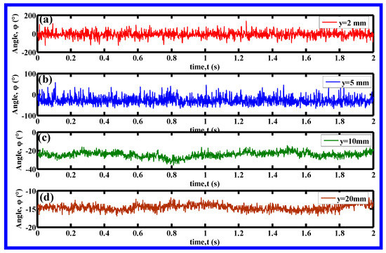 The fluctuant signals of the angle between the z-axis and the resultant velocity in the y–z plane at the (y, z) positions of (a) (2 mm, 6 mm), (b) (5 mm, 6 mm), (c) (10 mm, 6 mm), (d) (20 mm, 6 mm).