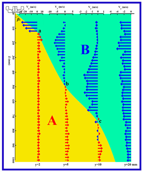 Figure 9 shows the distribution of the lateral velocity, vy, along lines 1–4 of y = 2, 5, 10, and 20 mm, in the corresponding y–z plane. Here, the lateral velocity component was calculated via multiplying resultant velocity by the angles, which are shown in Figure 6 and Figure 7. It should be pointed out that Figure 9 has a double abscissa, the upper and the lower abscissa are vy and y positions, respectively. For the vy along line 1 of y = 2 mm, the vy had a magnitude of 28 mm/s and had back-diffusion direction within the positions above the point “a” signed in this figure, however, the vy had a lateral diffused direction at positions below the critical point “a”. Here, ”a” is deemed to be the so-called boundary of veer, which has been mentioned above. At positions along lines 2 and 3 of y = 5 and 10 mm, vy has similar profiles to vy along line 1, moreover, the maximum value of vy decreased laterally far away from the z-axis, and the boundary points of veer are signed “b” and “c”, respectively. However, for the vy along line 4 of y = 20 mm, all vy has back-diffusion direction, even though the maximum vy is as small as about 4.5 m/s. In a word, as shown in Figure 9, air flow has the characteristic of lateral diffusion in region A (yellow region), and lateral back-diffusion in the region B (green region). To further represent the lateral diffused characteristic of air flow in the y–z plane, a diffused envelope angle, β, is built, which is defined by Equation (9) below. Furthermore, β is calculated to be about 17.1°.