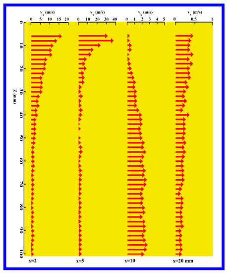 Figure 10 shows the distribution of lateral velocity, vx, along lines 5–8 of x = 2, 5, 10, and 20 mm in the x–z plane. Unlike the distribution of lateral velocity, vy, shown in Figure 9, all vx have direction along positive the x direction, showing that there is no critical boundary of lateral vx in the x–z plane. At the position nearest to the orifice of the die face, the maximum value of vx is about 15 m/s, which is approximately half of vy = 28 m/s, indicating that the polymer melt, which has just been squeezed out from the orifice, undergoes higher lateral velocity along y direction than along x direction. This phenomenon deserves to be an import reason for the anisotropic distribution of fiber path in the x–y plane, which will be further discussed below.