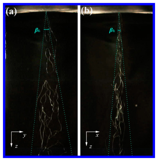 In melt blowing, the air is pushed out from air channels and ejected into the surrounding static atmospheric, therefore, the melt-blown air flow needs to be a free jet and have the feature of diffusion, that is, the cross-section of the air flow is ever increasing along the spinning line direction. The diffusion of air flow could be demonstrated by a lot of Computational Fluid Dynamics (CFD) simulations [9,12] and indirectly reflected by the splayed-out envelope of the fiber path, which is attributed to fiber vibration or whipping in the process of melt blowing [13,14,15]. A bundle of fibers that appeared to be splaying rather than a single fiber was firstly captured by Shambaugh [13]. This observation was similar to that from the naked eye. Similar splayed-out envelopes of fiber paths were also experimentally discovered by Bresee et al. [14] and Xie [15]. The increased envelope of the fiber path is assumed by the lateral air velocity component (direction normal to the spinning line), however, until now, the measurement of the lateral velocity component has not been reported and most of the air flow fields were measured along the spinning-line direction.