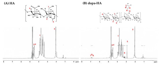 1H-NMR spectra of (A) HA and (B) dopa-HA.