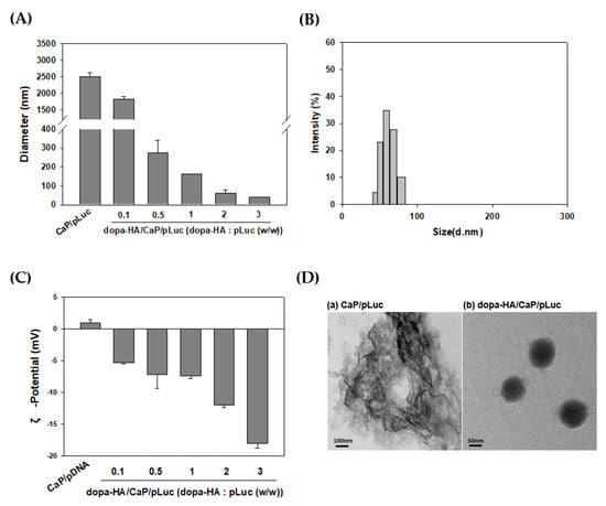 (A) Hydrodynamic diameter of dopa-HA/CaP/pLuc at various weight ratios. Values are given as the mean ± SD of triplicates. (B) Hydrodynamic diameter of dopa-HA/CaP/pLuc (w/w = 2). (C) Surface zeta-potential of dopa-HA/CaP/pLuc at various weight ratios. Values are given as the mean ± SD of triplicates. (D) TEM images of (a) CaP/pLuc and (b) dopa-HA/CaP/pLuc (w/w = 2). Size bar = 100 nm (a) and 50 nm (b).