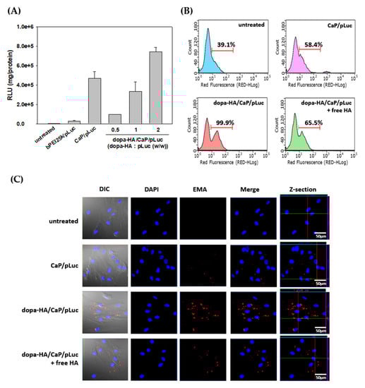 (A) Transfection efficiency of dopa-HA/CaP/pLuc (w/w = 2) in human mesenchymal stem cells (hMSCs). The bPEI 25 kDa (bPEI25k/pLUC, w/w = 1) and untreated cells were used as controls. Flow cytometry (B) and confocal microscopy (C) results of the cellular uptake of CaP/pLuc and dopa–HA/CaP/pLuc (w/w = 2) in the absence or presence of free HA.