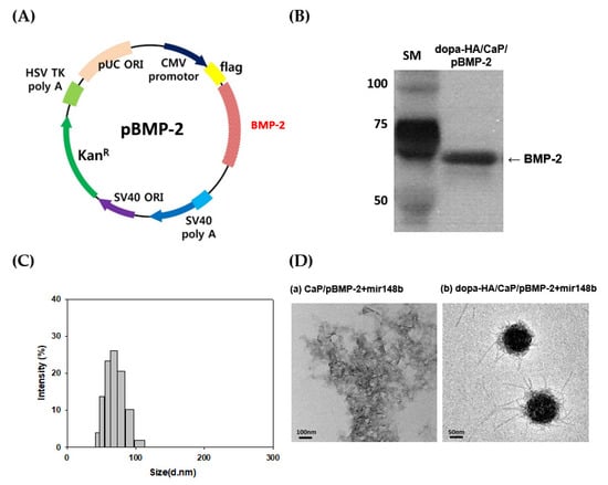 A pDNA encoding BMP-2 (pBMP-2) was constructed using a recombinant DNA technique (Figure 4A). The expression of the BMP-2 protein in hMSCs after the transfection of dopa-HA/CaP/pBMP-2 was confirmed by western blot analysis (Figure 4B). To improve osteogenic differentiation of hMSCs, we attempted to deliver two nucleic acids, pBMP-2 and mir148b. BMP-2 protein expressed from pBMP-2 can activate the upstream signals for osteogenic differentiation of hMSCs, and, at the same time, the simultaneously delivered mir148b can down-regulate the antagonistic extracellular modulator, Noggin, in the cells. The resulting nanoparticle containing pBMP-2 and mir148b (dopa-HA/CaP/pBMP-2+mir148b) had a diameter of 78 ± 9 nm (PDI: 0.43 ± 0.14) with a spherical morphology (Figure 4C). The hydrodynamic diameter of dopa-HA/CaP/pBMP-2+mir148b were not significantly changed compared to the nanoparticle containing pDNA alone (p = 0.295). The morphology of dopa-HA/CaP/pBMP-2+mir148b was also spherical, as shown in Figure 4D. This may be because both pDNA and miRNA, having similar physicochemical properties, were physically entrapped in the inorganic matrix of CaP.