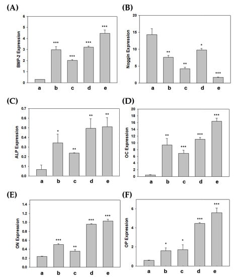 Expression profiles of (A) BMP-2 and (B) Noggin in hMSCs after transfection. Expression levels of osteogenic differentiation markers, including (C) alkaline phosphatase (ALP), (D) osteocalcin (OC), (E) osteonectin (ON), and (F) osteopontin (OP), were analyzed by quantitative RT-PCR. Experiments were carried out in duplicate and expressed as a mean ± SD. a. untreated; b. CaP/pBMP-2+mir148b; c. dopa-HA/CaP/mir148b; d. dopa-HA/CaP/pBMP-2; e. dopa-HA/CaP/pBMP+mir148b. Statistical difference between a test group and untreated control (a) was tested using Student’s t-test. * p < 0.05, ** p < 0.01, *** p < 0.001.