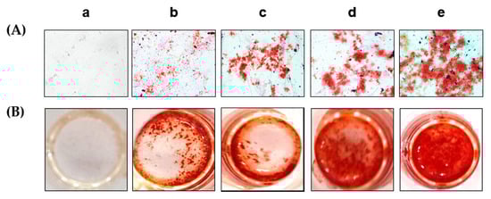 Induction of osteogenic differentiation of hMSCs. (A) von Kossa staining image of hMSCs after transfection with the indicated formulation. (B) Calcification of the cells detected by Alizarin Red S staining. The assays were carried out two weeks after the transfection. (a) untreated; (b) CaP/pBMP-2+mir148b; (c) dopa-HA/CaP/mir148b; (d) dopa-HA/CaP/pBMP-2; (e) dopa-HA/CaP/pBMP+mir148b.