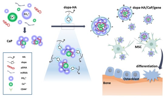 Schematic illustration of dopa-HA/CaP-based gene delivery to mesenchymal stem cells.
