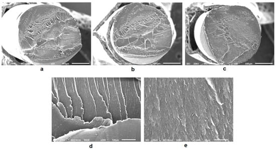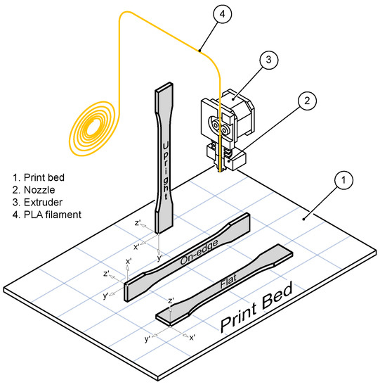 In the cases of the On-edge and Flat orientations, the specimens were pulled perpendicular to the layer deposition direction and hence fibers were pulled parallel to the loading direction, resulting in trans-layer failure. In this case, individual fibers withstood most of the applied load and fiber breakage was observed [6,13,61,62,63]. If Flat and On-edge orientations were pulled parallel to the layer deposition direction, inter-layer failure is expected in a similar way to the Upright orientation with lower tensile strength than in the case of trans-layer failure.