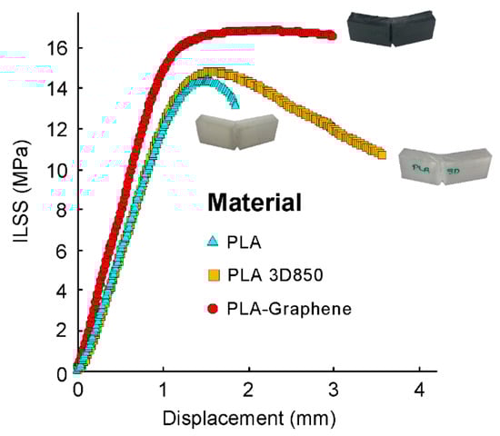In addition, Table 5 shows average values and standard deviation of maximum interlaminar shear strength for the three PLA-based materials. The results revealed that PLA and PLA 3D 850 samples exhibited similar interlaminar shear strength. In addition, PLA 3D850 samples exhibited the maximum ductility in terms of maximum displacement, which is in good agreement with the trends observed for on-edge and flat orientations in flexural performance. On the other hand, PLA-Graphene composite samples showed the highest interlaminar shear strength. These results were in accordance with the enhanced interlaminar adhesion and performance showed by the PLA-Graphene samples under tensile and flexural loading.