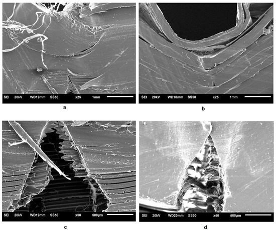 Finally, SEM examination of the cross-sectional ILSS samples was performed to obtain information on the interlayer performance. Figure 7 depicts SEM images showing details of the interlaminar shear failure surfaces of PLA 3D850 and PLA-Graphene samples. In general, the results highlighted interlaminar shear failure due to delamination of the thermoplastic layers in both materials (Figure 7a,b) and the initiation of breakage in the lower layers (Figure 7c,d). These results have confirmed the observations of previous studies [20,22,39,49].