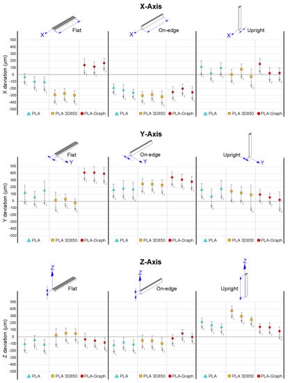 Dimensional accuracy results of PLA-based samples as a function of build orientation and the type of material. The results of three samples of each set are shown, including the mean, maximum and minimum values of each sample for comparative purposes.