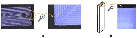 There is a broad spectrum of infill patterns, making it difficult to analyze the influence of raster patterns. In this study, solid samples filled with a perimeter raster were analyzed, which is where shell thickness was selected long enough to fill the sample with a raster angle of 0° (Figure 3d). In other words, the tool paths are the offsets from the perimeter with a distance equivalent to the nozzle size.