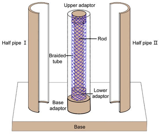 A stainless-steel casting mold was explicitly designed and fabricated to form a braided fiber strut reinforced hydrogel vascular graft. Briefly, the mold was composed of seven parts, i.e., base, base adaptor, lower adaptor, upper adaptor, rod, and two half pipes (Figure 1). The inner and outer diameters of the reinforced graft were designed to be 6 and 12 mm, respectively. Thus, the diameter of the rod was 6 mm. The outer diameters of the lower and upper adaptors and the inner diameter of the braided fiber strut were the same, i.e., 9 mm.