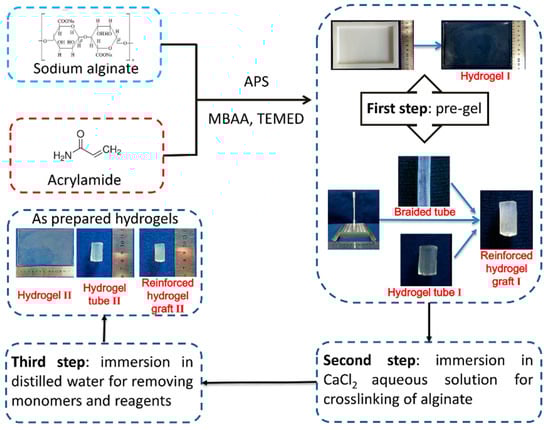 Because of their hydrophilicity and biocompatibility, hydrogels have found multifaceted applications in biomedicine [17,18], for example, as scaffolding materials for tissue formation, vehicles for drug and growth factor delivery [19,20,21,22], protection layer for encapsulated cells [23,24,25], and so on [21,26,27]. In particular, in consideration of their anti-coagulation and hemocompatibility [28], hydrogels may find great use in vascular grafts. However, some associated weaknesses such as poor mechanical properties and high swelling capacities should be addressed. Thus, increasing efforts have been made to improve the mechanical properties and control the swellability of hydrogels [29,30].