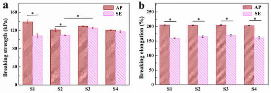 Results of the tensile breaking strength and tensile breaking elongation tests of four hydrogels (S1: 3h; S2: 4h; S3: 5h; S4: 6h). (a) Tensile breaking strength. (b) Tensile breaking elongation; * means significant difference at p < 0.05, AP: as-prepared hydrogels, SE: hydrogels at swelling equilibrium.