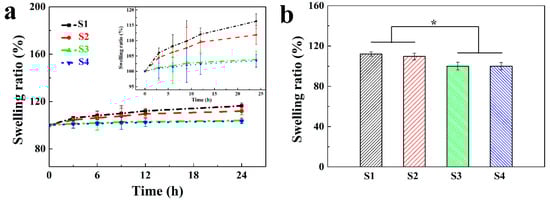 A series of tensile tests were performed on the hydrogels with different immersion times (S1: 3h, S2: 4h, S3: 5h, and S4: 6h) to determine the optimal crosslinking time. Figure 4 shows the results of the tensile breaking strength and tensile breaking elongation of four types of hydrogel (S1–S4) (n = 3). The tensile breaking strengths of S1 and S2 decreased significantly after reaching the swelling equilibrium compared to those of the as-prepared hydrogels (Figure 4a). Meanwhile, a significant increase in water content and volume were seen for S1 and S2 hydrogels upon reaching the swelling equilibrium. While no apparent changes were observed for S3 and S4 before and after swelling equilibrium, the tensile breaking strength of S3 was much higher than those of S1 and S2. This phenomenon could be explained by the fact that the ionic crosslinking increased over prolonged immersion times till 5 h, and then the crosslinking of G blocks of alginate with Ca2+ reached its plateau by 5 h; as a result, the tensile strength increased with the increase of the crosslinking degree.