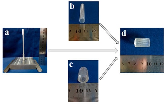 Images of the stereo-casting mold (a), braided polyethylene terephthalate (PET) tube (b), hydrogel tube (c), and reinforced hydrogel graft (d).