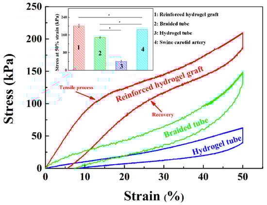 Native blood vessels are strained inside the body and they are shortened upon cut-off from the primary site, e.g., the length of a swine carotid artery is reduced to 2/3 of its original length upon cut-off from the body [42]. Therefore, the length of an implanted vascular graft should refer to the original length of a target native blood vessel, and, ideally, the graft should have the same elongation rate as the native vessels. The tensile properties of the reinforced grafts were evaluated, setting the strain to 50%. The results showed that the incorporation of a braided fiber strut significantly improved the mechanical properties of the grafts (Figure 7), and the reinforced graft could almost completely recover to its original shape upon relief of the force. More importantly, a simultaneous response of the braided fiber strut and the hydrogel tube was invariably found, without any mismatch or interfacial separations. The measured stress of the reinforced grafts was almost the sum of those of the braided fiber strut and of the hydrogel tube and reached 201.3 ± 6.91 kPa with a set strain of 50%, close to but still higher than that of a swine carotid artery (p < 0.05) (Figure 7 inset). This observation implies that the strut-reinforced grafts can meet the tensile strength requirements for clinical application.