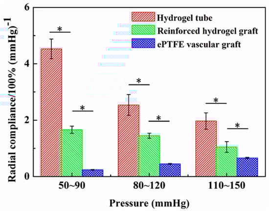 The compliance of a vascular graft plays a pivotal role in maintaining a healthy blood flow, avoiding abnormal tissue hyperplasia and thrombosis [43,44]. However, the compliance of the existing vascular grafts made of either PET or ePTFE was low, corresponding to less than 1% [41], which partly accounts for the unsuitability of such grafts for small-diameter vessels [45]. The circumferential compliances of the reinforced graft, hydrogel tube, and a commercial ePTFE vascular graft were respectively tested according to the standard ISO 7198: 2016 on the BOSE platform under three spans of pressures, i.e., 50–90, 80–120, and 110–150 mmHg. The measurement revealed that the compliances of the hydrogel tubes and the reinforced grafts were much higher than that of the ePTFE vascular grafts (p < 0.05) in all three pressure conditions, despite a decreased compliance of the reinforced grafts by the braided fiber strut (Figure 8). The compliance of reinforced hydrogel grafts under a pressure of 50–90 mmHg reached (1.7 ± 0.1)%/100 mmHg, significantly higher than that of the ePTFE vascular grafts, indicating the superiority of reinforced hydrogel grafts for the substitution or bypass of small-diameter blood vessels.