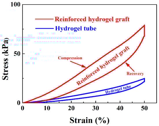 In addition to the tensile strength, the compressive strength of both the hydrogel tube and the reinforced graft was tested. As shown in Figure 9, the incorporation of the braided fiber strut in the reinforced grafts significantly increased the compressive strength of the grafts, demonstrating the vital role of the braided fiber strut in strengthening the radial mechanical properties. Upon relief after compression to 50% of the outer diameter, the radial elastic recovery could reach (90.1 ± 1.3)%.