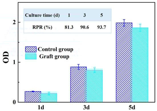 Strut-reinforced vascular grafts sterilized by autoclave were incubated in cell culture media for 24 h to prepare the conditioned cell culture media (CM). PIECs were divided into two groups, i.e., graft-incubated group (CM) and control group (CG, complete culture media). The cells cultured in either CM or CG media for 1, 3, and 5 days were analyzed with the WST assay. As shown in Figure 11, the optical density (OD), proportional to the cell number, increased over the culture time, and the relative proliferation ratio (RPR, %) in CM and CG for 1, 3, and 5 days was 81.3%, 90.6%, and 93.7%, respectively. On the basis of the criteria for cytocompatibility [48], the strut-reinforced vascular graft can be defined as non-cytotoxicity, consistently with previously reported results [31].