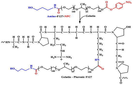 In round flasks, 0.25 g of gelatin was dissolved in distilled water at 40 °C under stirring for 1 h and storage below 25 °C for further reaction. 4.5 g of NPC-F127 (F87) -OH respectively dissolved in distilled water at 4 °C and then added dropwise to the gelatine solutions under stirring for 24 h at 25 °C. The reaction mixtures were dialyzed against cold DI water using Cellulose dialysis membrane (12,000–14,000 Mw). After 3 days, the sample was lyophilized to obtain pluronic-conjugated gelatine in white solid form. The grafting efficiency of copolymers was characterized by Fourier transform infrared (FTIR), proton nuclear magnetic resonance (1H-NMR), thermal gravimetric analysis (TGA) and critical micelle concentrations (CMC).