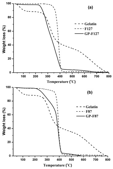 Moreover, the thermogravimetric analysis (TGA) test further confirmed this conclusion. Figure 3 shows the TGA curve of amphiphilic gelatin copolymer (solid line), pure gelatin (dashed-dotted line), and pure pluronic (dashed line). For pure gelatin, the first weight loss at approximately 120–140 °C is due to the removal of water; the second weight reduction started at about 200 °C, revealing the denature of gelatin structure through the broken intermolecular interaction between amino acids forming the 3D structure of gelatin [49]. There are nonsignificant points in thermal behavior of both kinds of pluronic, F127 (Figure 3a) and F87 (Figure 3b). Both show the single step of weight loss between 300–410 °C. This is consistent with previous reports related the decomposition of Pluronic polymer [50]. TGA curves of all amphiphilic gelatin copolymers (GP-F87 and GP-F127) are exposed the greatest reduction in mass in the temperature range of 250–420 °C, which are induced by the disintegrating intermolecular interaction as well as the partial interrupting molecular structure of GP. This implies the presence of gelatin in these graft copolymers, which can explain the difference in thermal decomposition behavior. In other words, the introduction of gelatin helps to increase the thermal stability of pluronic. Thermal decomposition temperature of both pluronics are around 410 °C while GP and pure gelatin are around 600–800 °C. Regrading to these thermal behavior of all samples, grafting efficiency was calculated via the percent weight loss of GP samples at 420 °C at which pluronic backbone was completely decomposed. Based on the ratio between weight loss of pure gelatin and its remained mass in GP at 420 °C, the weight loss of grafted pluronic on gelatin backbone was calculated, following the report of Kang et al. [51]. The graft yield of GP-F127 was 49.45% whereas yielding of 54.7% was achieved in case of GP-F87 as seen in Table 1.