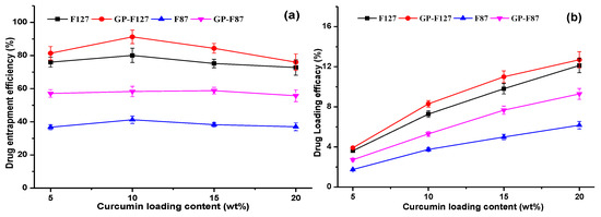 In the manner of drug delivery system, entrapment efficiencies (EE) and drug-loading efficacy (DL) are a crucial parameter that directly affects the therapeutic efficacy of the system [53]. In this study, the curcumin loading ranged from 5 to 20 wt% while variations such as the final concentration of carriers, the condition of ultrasonication (time, power as well as amplitude) were kept as constant. As shown in Figure 5a, the EE of all carriers increase to highest values when curcumin content used at 10% with respect to copolymers content. And then the significant reduction was observed after further feeding curcumin (15–20 wt% of concentration) at all studied cases. In order words, the DL of the all carriers significantly increased at formulations loading from 5 to 10% of curcumin and slightly increased after the point as seen in Figure 5b. Therefore, drug-releasing behaviors were further studied using the 10 wt% of curcumin. The EE of pluronic micelles are much lower than that of its GP nanogels around 10–15 wt%. These results could be affected by both interactions of curcumin with hydrophobic PPO segment and characteristic of gelatin structure.