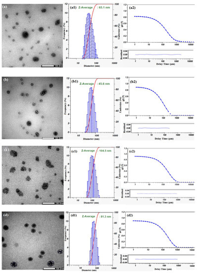 For encapsulating nCur, it is vital to select a mixture of an organic solvent for dispersion of curcumin and partial compatibility with amphiphilic copolymers. In some investigations, ethanol showed a fair estimate of the proportions of its keto-enol forms of curcumin [55]. Dichloromethane (DCM) is one of the best solvents to use in extraction as well as in nCur processing [56,57]. Regarding our screening experiments, the co-solvents (ethanol and DCM) were used to produce nCur in amphiphilic copolymer solutions under ultrasonic-assisted condition. Transmission electron microscopy (TEM) was employed to study the morphology, whilst size and dispersion of nanoparticles was examined via dynamic light scattering (DLS). Figure 6a demonstrates that nCur/F87 have spherical morphology with hydrodynamic diameter of about 65.1 nm (Figure 6(a1)). Upon the self-assembly of pluronic copolymer, curcumin molecules was encapsulated in the hydrophobic regions of formed nanogels in cases of study. The hydrophobic interaction between the hydrophobic domain of Pluronic and the aromatic phenols of curcumin molecules to form intermolecular complexes may be the main inducing force for the formation of nanogel. From TEM images, Figure 6a,c show nCur-loaded micelles or nanogels formed ranging from 10 to 100 nm in which a distinguishable presence of nCur is apparent in these images. However, Figure 6b,d show the slightly different morphology of nCur-encapsulated pluronic F127 micelles or GP-F127 nanogels. In Figure 6b, the core–shell nanoparticles appear in a wide range from 20 to 100 nm in diameter. The behavior could derive from the encapsulation of hydrophobic (nCur) in hydrophobic domains of pluronic molecules. In the case of GP-F127 encapsulation, the diameter of these spheres is ranging from 40 to 70 nm. Moreover, a higher density of nCur aggregated in GP-F127 nanogels as seen in Figure 6d. This phenomenon could be produced by the characteristic of nCur and GP-F127 copolymers such as hydrophobicity and electrostatic interaction with each other. For further studies, size distribution of the the nCur-loaded GP-F127 were obtained from DLS indicating their homogeneous dispersion in colloidal solution as seen in Figure 6(d1) when compared nCur-loaded micelles or GP-F87 nanogels (Figure 6(a1–c1)). Moreover, in Figure 6(a2–d2), the normalized intensity autocorrelation functions g2(τ) fit to a stretched exponential forms which could indicated that the nanoparticles produced at the spherical micelles without free unimers [58]. The results could confirm that the nanoparticles showed a high stability in colloidal solution without any dissolution or aggregation.