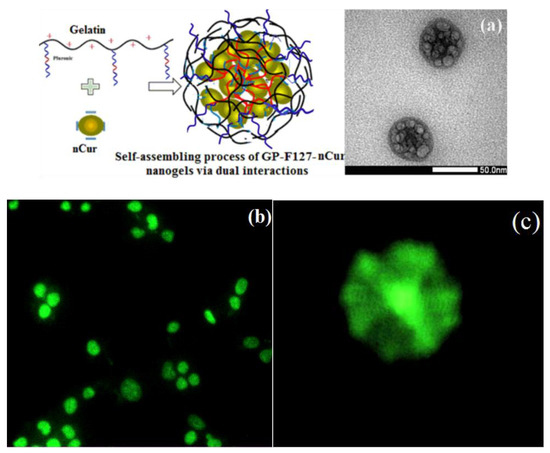 Regarding to the obtained results, the self-assembling process of GP-F127-nanogels and nCur could be demonstrated in Figure 7a leading to improve curcumin-loading efficiency in the nanogel. Moreover, during self-assembly process, the hydrophobic segments on pluronic as well as gelatin structure in turn to aggregate to reduce the interaction with the aqueous environment and increase interaction with the inner loaded ncur. The phenomenon could be well-observed regarding to characteristic in fluorescent adsorption of curcumin at 425 nm excited wavelengths. The colloidal GP-F127-nCur nanogels were prepared in microscope glass slides without any label agents and capped with coverslips. Fluorescent images of the Andor Dragonfly confocal microscope indicated morphology of the nanocurcumin-encapsulated cationic and amphiphilic GP-F127 copolymer (as seen in Figure 7b,c).