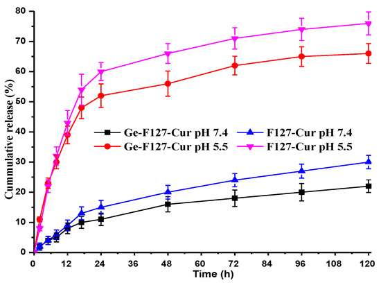 Curcumin release behavior from pluronic F127 micelles and GP-F127 nanogels were performed under in vitro conditions at acidic and physiological pH mediums. It is established that cancer cells are acidic. Thus, release studies were performed at pH 5.5 and pH 7.4. The Cur release studies were carried out for 120 h. Cur-loaded pluronic micelles and nanogels show a sustained released behavior at pH 5.5 which reach to 75% after 120 h as seen in Figure 8. Moreover, the rate is much faster than that of pH 7.4, which is only approximately 20% at the same time. The contrast in release curves in both pH values could be explained by the effect of pH on ionization of a hydrophobic molecule like a case of Ibuprofen-loaded pluronic-F127 [58]. A higher pH leads to stronger ionization of the molecule that loosens hydrophobic core of pluronic resulting in the increased release rate of the loaded molecules. A slower release rate could see in GP-F127 at both pH points which is assigned with electrostatic of curcumin and positive-charged gelatin chains. The conjugation of the gelatin results in extending the applicability of Pluronic F127 in drug-controlled delivery.
