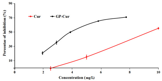 To assess the potential of anticancer cell growth of nCur-loaded GP nanogels for further applications, the in vitro cytotoxicity of the free Cur in DMSO and the nCur-loaded nanogels evaluated using human breast cancer cell lines (MCF7). The in vitro half-maximum inhibitory concentration (IC50) is the quantitative parameter to evaluate the cell toxicity induced by samples that were calculated from Figure 9. In the figure, the sample of free curcumin performs low toxicity against MCF7 cancer cell growth with IC50 value at 9.40 ± 0.17 mg/L (25.54 ± 0.18 µM). The value is also approximately equal to Paola’s report, which is 29.3 ± 1.7 μM in MCF-7 [59]. It is interesting that the IC50 of the nCur-loaded nanogels sample was calculated at a significantly low value that was 4.02 ± 0.11 mg/L (10.92 ± 0.3 µM). The result indicated a higher activity against the cancer cell growth as compared with free curcumin. The performance could be explained various reasons such as low stability of curcumin in physiological condition, efficient protection and well-controlled delivery of the bioactive molecule from GP nanogels. Moreover, it could derive from the characteristic of the gelatin-based nanogels such as its Arg-Gly-Asp sequences promoting cell adhesion and highly electrostatic interaction of the positive-charged nanogel with cancer cell membrane [44].