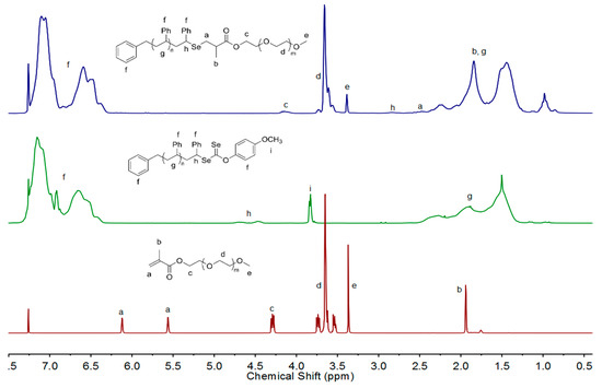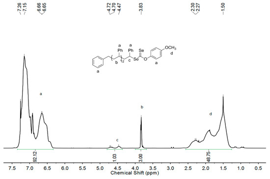 The diselenocarbonate-end capped polymers were prepared through the organoselenium-mediated polymerization of styrene (St) according to our previous reports [33]. Two polymers, PS-Se-1 and PS-Se-2, with different molecular weights and narrow molecular weight distribution (<1.20) were prepared, as detailed in Table 1. The structure of PS-Se-1 was characterized by 1H NMR. As shown in Figure 1, the signals at δ 3.78 ppm (3H, I3.78 = 3.00) were ascribed to the protons of the methoxy group (–OMe), and the signals around δ 4.50 ppm (1H, I4.43-4.68 = 1.06) were ascribed to the protons of CH-Se. The signals at around δ 7.00 ppm (5H, I6.60-7.11 = 92.1) were ascribed to the protons of the phenyl group. Thus, the molecular weight (Mn, NMR) can be calculated to be 2100 g mol−1 by the equation Mn, NMR = 104 × [(92.1 − 9) / 5] + 91 + 295. The polymers were also measured by using SEC with coupled refractive index (RI) and UV detectors (Figure 2). The two curves almost coincide, and the molecular weight (Mn,GPC = 1900 g mol−1) was close to the value obtained by 1H NMR. All evidence proved the high chain end functionality of the diselenocarbonate-ended polystyrene (PS), which ensured further chain end modification.