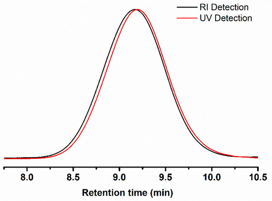 SEC curves of PS-Se-1 (Mn, SEC = 1900 g mol−1, Ð = 1.20) measured by RI and UV detection at the wavelength of 340 nm.