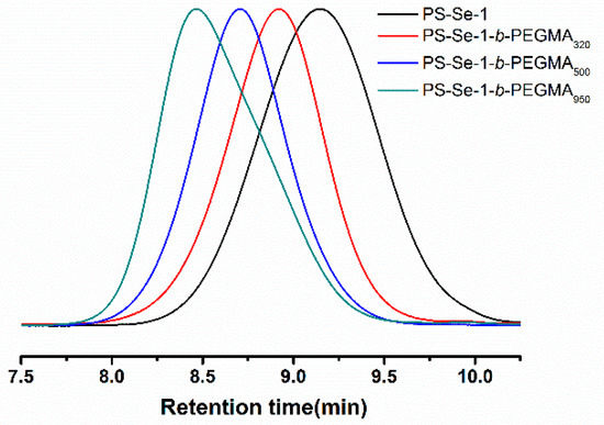 SEC curves of PS-Se-1 (Mn,SEC = 1900 g mol−1, Ð = 1.14), PS-Se-1-b-PEGMA320 (Mn,SEC = 2700 g mol−1, Ð = 1.09), PS-Se-1-b-PEGMA500 (Mn,SEC = 3200 g mol−1, Ð = 1.09), and PS-Se-1-b-PEGMA950 (Mn,SEC = 3700 g mol−1, Ð = 1.11).