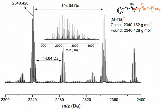 After studying reaction condition optimization for selenol-based nucleophilic reaction of PS-Se-1 with PEGMA950, PEGMAs with different molecular weights were examined. The results are listed in Table 3. PS-Se-1 reacted efficiently with PEGMA and the conversion rate of PS-Se-1 with PEGMA320 peaked at 95.4%, and the conversion rate of PS-Se-1 decreased with the increase of molecular weight of PEGMA. The Mn of copolymers was determined by SEC. As shown in Figure 3, the curves shifted significantly after the nucleophilic reaction, which evidenced the successful modification of PEGMA at the end of PS-Se-1. In the 1H NMR spectra, the proton signals of the corresponding vinyl shifted from 6.10 and 5.54 ppm to 2.57 and 2.49 ppm, and the proton signals of CH groups close to Se shifted from 4.70 and 4.47 ppm to 2.84 ppm, indicating a complete conversion of PEGMA (Figure 4). Also, MALDI-TOF mass spectrometry was used to further characterize the structure of the copolymer. As shown in Figure 5, the main population at the isotropic peak at 2340.428 m/z matched the theoretical calculation well (2340.152 m/z). Furthermore, two main sequence peaks are very close to the styrene (104.15 g mol−1) and CH2CH2O (44.03 g mol−1) units. All the evidence indicated the efficiency of this reaction.