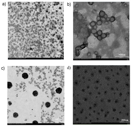 TEM images of self-assembled nanoparticles formed by PS-Se-1-b-PEGMA (Mn,SEC = 3700 g mol−1, Ð = 1.11, 1 × 10−4 M) at (a) × 10.0 k and (b) × 70.0 k magnification. TEM images of nanoparticles 5 h after adding H2O2 solution at (c) × 10.0 k and (d) × 25.0 k magnification.