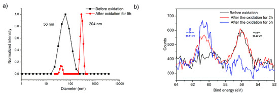 Selenium-containing copolymers have shown redox responsiveness in many systems. Some selenide-containing aggregates can respond rapidly to external redox stimuli and subsequently release the incorporated species under mild conditions [26,28]. Here, self-assembly behavior of the three copolymers were investigated. It was found that PS-Se-1-b-PEGMA950 could self-assemble spontaneously in aqueous solution through hydrophobic/hydrophilic interaction. As shown in Figure 6, the TEM measurement of PS-Se-1-b-PEGMA950 micelles showed spherical aggregates with an average diameter of 30 nm. The DLS results are in accordance with the TEM results with an average diameter of 56 nm (Figure 7a). It is noteworthy that the micelles were quite stable in an ambient environment and could maintain their structures for at least one month. Then, H2O2 solution was used as the oxidant to study the oxidation responsiveness of the selenide block copolymer aggregates. From the TEM images shown in Figure 6c,d, the micellar structure was converted to irregular aggregates after two hours of oxidation process, and these irregular aggregates were further decomposed for another three hours. The DLS results also proved that the morphology change of the aggregates occurred after adding H2O2 solution. Furthermore, XPS was also used to analyze these micelles before and after oxidation treatment. As shown in Figure 7b, the binding energy of Se 3d5 shifts from 56.22 eV to 60.81 eV, suggesting a higher valency of selenium which is close to the seleninic acid group [21]. All the results proved that oxidative cleavage of the selenide linkage leads to the morphology change of the micelle.
