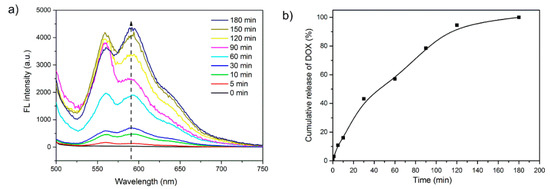 The anticancer drug doxorubicin (DOX) was chosen as a model molecule for encapsulation. The self-assembly of PS-Se-1-b-PEGMA950 (1 mg mL−1) was conducted in DMF solution in the presence of DOX (0.1 mg mL−1), which has a characteristic maximum emission at 590 nm. The DOX-loading micelles were purified with dialysis membrane, and the DOX concentration was calculated by the fluorescence emission spectra. The drug loading content (DLC) was evaluated to be about 1.5%, and drug loading efficiency (DLE) was evaluated to be about 13.3%. Oxidation-triggered drug release studies in vitro were investigated at pH 7.4 and 25 °C by using H2O2. After oxidation for a specific time, the fluorescence emission of DOX was monitored, as shown in Figure 9a. The fluorescence intensity of DOX at 590 nm increased gradually, owing to the release of hydrophobic DOX from the drug carriers. The percentage release was calculated based on the fluorescence changes at 590 nm. The percentage release profile was plotted as a function of time, as shown in Figure 9b.