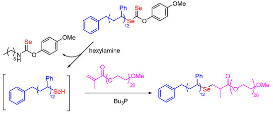 - Lu, W.H.; An, X.W.; Gao, F.; Zhu, J.; Zhou, N.C.; Zhang, Z.B.; Pan, X.Q.; Zhu, X.L. Highly Efficient Chain End Derivatization of Selenol-Ended Polystyrenes by Nucleophilic Substitution Reactions. Macromol. Chem. Phys. 2017, 218, 1600485. [Google Scholar] [CrossRef]