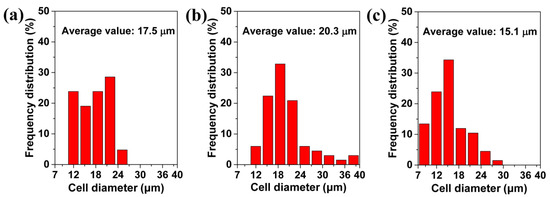 The average value of cells on the surface of TPU perforated membrane saturated under 1.5 MPa and foamed at different temperatures of: (a) 120 °C, (b) 130 °C, and (c) 140 °C.