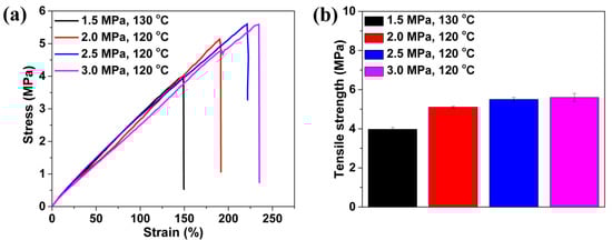 Tensile performance of TPU perforated membranes saturated and foamed under different pressures and temperatures. (a) typical stress-strain curves and (b) the tensile strength.