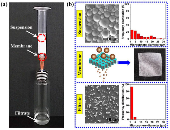 For example, the TPU perforated membrane saturated under 3.0 MPa was used to separate the polystyrene microsphere so as to evaluate the filtration performance. Figure 10a shows a simple filter device. Based on the colour change in the suspension and filtrate; namely, the white suspension and transparent filtrate, this membrane can act as an effective separation instrument for water treatment and particle collection. The TPU-perforated membrane, without any support device, was placed directly between the syringe and the needle, and the operation process was implemented without external pressure. The suspension flowed through the TPU-perforated membrane, and the filtrate was collected in the glass bottle for the particle size statistics. In Figure 10b, the SEM images and the corresponding particle size statistics are shown both before and after the filtration. As we had expected, the decreased maximum size of the microsphere from 31.4 to 4.6 μm and the narrower size distribution were clearly seen. This result shows that the TPU perforated membrane can effectively remove large particles from the suspension.