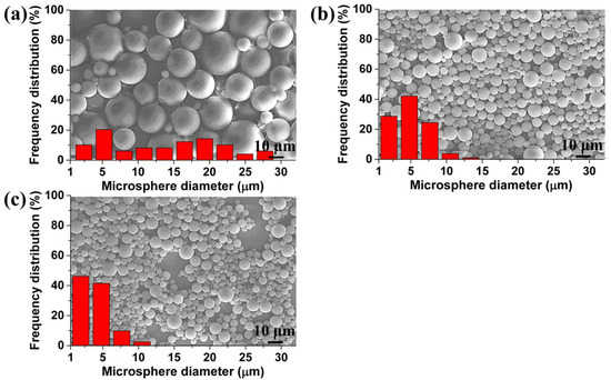 SEM images and size distribution of microspheres in the filtrate, obtained from the membrane with: (a) 20.3 μm, (b) 11.6 μm, and (c) 6.4 μm average cell diameter on the surface.