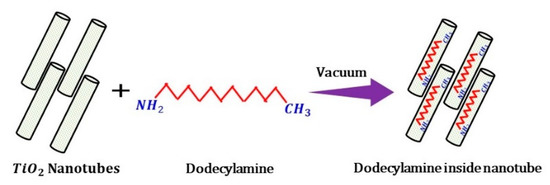 Schematic diagram showing the loading of dodecylamine (DOC) inside titanium oxide nanotubes (TNTs).