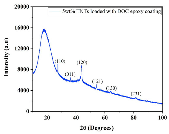 XRD pattern of synthesized nanocomposite coatings containing 5 wt.% TNTs loaded with DOC is shown in Figure 3. A broad peak at 2θ~20° is a characteristic peak of epoxy showing its amorphous polymeric nature. Some other peaks of TiO2 are also seen in the pattern due to the use of TNTs as nanocontainers. No peaks of DOC were noticed in the XRD pattern.