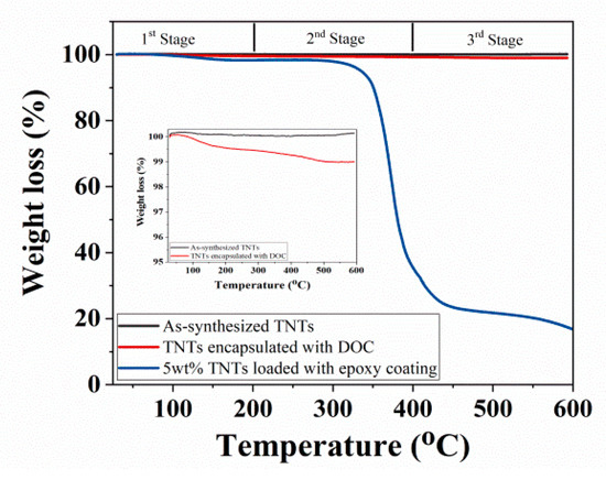 Thermal analysis of as-synthesized TNTs, TNTs loaded with DOC, and developed nanocomposite coatings are compared in Figure 5. It is noticed that the nanocomposite coatings remain quite stable in the first stage from room temperature to about 200 °C. However, there is a significant weight loss of the nanocomposite coatings observed in second stage, when the temperature is increased from 300 °C to 400 °C. This weight loss can be attributed to the thermal degradation of epoxy. There is almost no weight loss observed for the nanocomposite coatings in the third stage (400–600 °C). As a comparison, TNTs remains stable (no weight loss) up to 600 °C (being a ceramic phase). A small amount of weight loss (0.58%) of TNTs is probably due to the removal of moisture content. Similarly, TNTs loaded with DOC shows no weight loss in the first stage but small weight loss observed in the second stage from about 200 °C. A total of 1% weight loss occurred in TNTs encapsulated with DOC and this is probably due to the thermal decomposition of DOC.