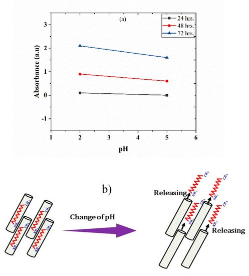 The release of DOC inhibitor from TNTs with respect to time at different pH values has been studied by UV-vis spectroscopy. Figure 6a shows the UV-vis spectroscopic analysis of TNTs loaded with DOC immersed into a 0.1 M NaCl solution at pH 2 and 5. Absorbance peaks showing the release of DOC from TNTs in response to pH change can be noticed. The absorbance value at 200 and 230 nm can be assigned to the presence of inhibitor in the solution. There is no significant absorbance value observed in the 24 h, indicating no release of DOC from the TNTs. However, after the 48 h, peak intensity value shows the release of inhibitor in response to pH change. There is an increase in the intensity of peaks after 72 h, showing more release of inhibitor form TNTs. Almost the same peak intensity was observed at both pH 2 and 5 but a slightly higher peak was observed at pH 2 as compared to pH 5. This analysis indicates that the release of DOC from TNTs is time-dependent and sensitive to the aggressiveness of the corrosive medium. Local change in the pH during corrosion process act as the trigger for the release of DOC from TNT as initiation of corrosion activity is accompanied by local change of pH in anodic and cathodic sides [20]. TNTs loaded with DOC perform better in a more acidic environment. This is consistent with the previous studies [27]. The self-release of DOC from TNTs in response to pH change is also schematically shown in Figure 6b.