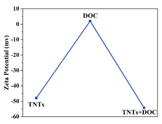 The potential stability of the colloidal system was studied by zeta potential as a function of the TNTs concentration in deionized water. Figure 7 shows the zeta potential values of TNTs, DOC, and TNTs loaded with DOC. As-synthesized TNTs and TNTs loaded with DOC exhibit negative zeta potential. The zeta potential value for the as-synthesized TNTs is −47.9 mV while DOC has a slightly positive charge of 2 mV. Addition of the DOC into TNTs causes a slight decrease in the value of the zeta potential (−54.2 mV). It should be noted that a zeta potential value greater than 30 mV indicates good stability of the TNTs. This analysis suggests that no agglomeration takes place. Furthermore, the change in the concentration of the loaded TNT with DOC does not affect the zeta potential considerably. This is expected since previous studies have shown that a great shift in zeta potential values are observed for concentrations below 10−4 wt.% [42].